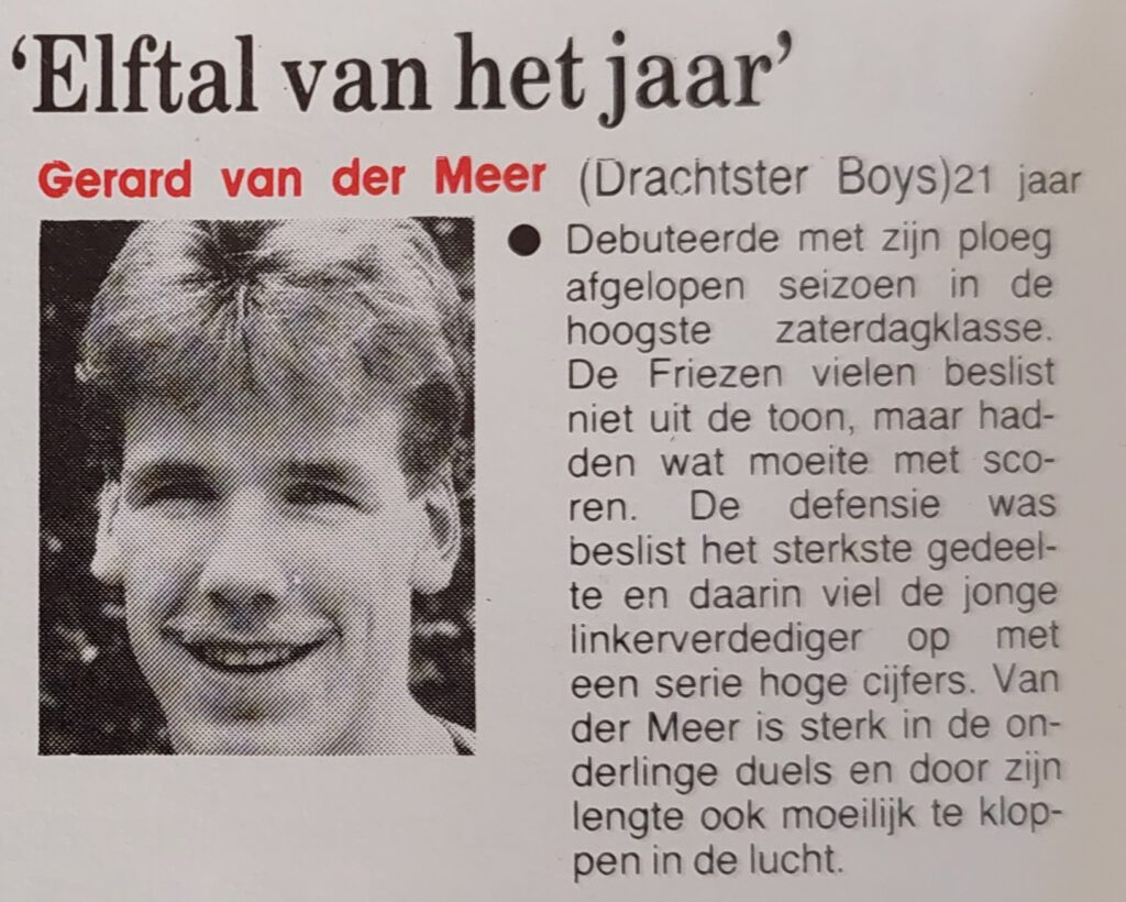 Gerard van der Meer wordt vier keer verkozen in het door de correspondenten van het Nieuwsblad van het Noorden samengestelde ‘Elftal van het Jaar’. Op de afbeelding een fragment van het programmablad van de op 2 augustus 1990 gespeelde oefenpartij tussen het “Elftal van het Jaar” en de BVO Emmen.